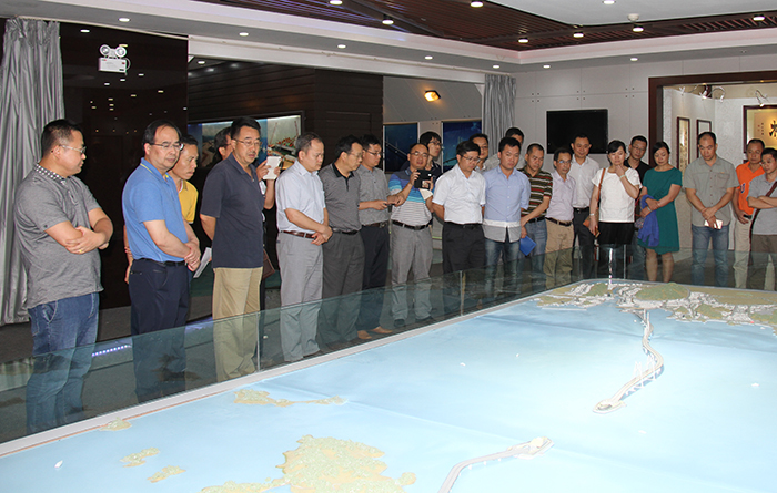 在港珠澳大橋管理局展廳,管理局蘇權(quán)科總工程師向考察團(tuán)介紹了港珠澳大橋建設(shè)背景、工程概況、技術(shù)難點(diǎn)、工程進(jìn)展等情況。集團(tuán)公司學(xué)習(xí)考察人員就工程建設(shè)管理模式、防災(zāi)減災(zāi)設(shè)計(jì)、耐久性設(shè)計(jì)、沉管對(duì)接方案、人工島筑島工藝等問題與大橋項(xiàng)目管理人員進(jìn)行了探討交流。